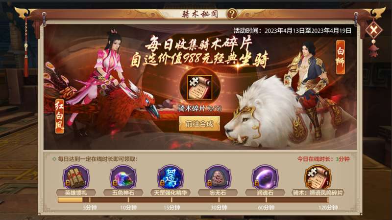 红白凤、白狮经典坐骑,上线参与“骑术秘闻”活动即得:当年为骑上英姿飒爽的60级门派坐骑,众多少侠为购买骑术疯狂攒钱,倍受折磨,对门派坐骑可谓记忆深刻,又爱又恨。在4月13日至4月19日期间,少侠在《天龙八部手游》中登录,参与“骑术秘闻”活动,只需5天,即可在峨嵋、明教经典坐骑【自选不限期经典坐骑-红白凤/永久经典坐骑-白狮】中二选一。而且为了满足各位少侠搜集意愿,天龙八部手游取消坐骑的门派限制,人人皆可拥有。