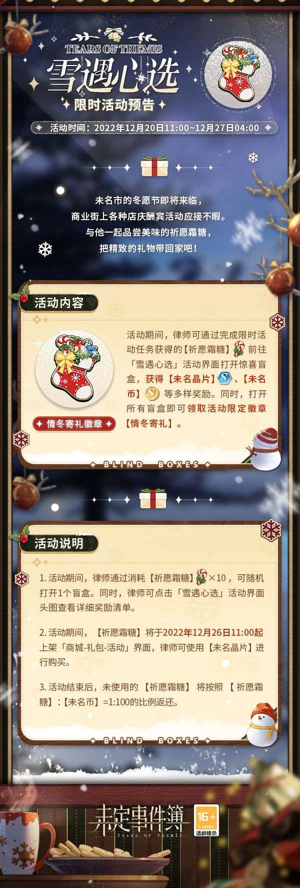 活动期间,律师可通过完成限时活动任务获得的【祈愿霜糖】前往「雪遇心选」活动界面打开惊喜盲盒,获得【未名晶片】、【未名币】等多样奖励。同时,打开所有盲盒即可领取活动限定徽章【情冬寄礼】