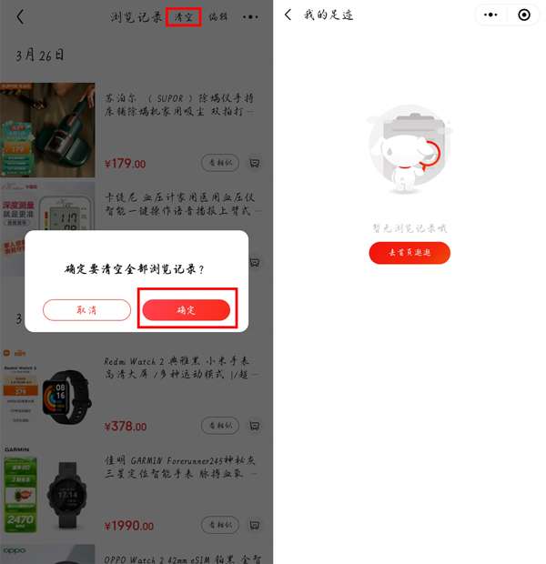 3、在京东app中找到我的>浏览记录>清空>确定,然后返回微信中的京东购物小程序,即可发现足迹删除。