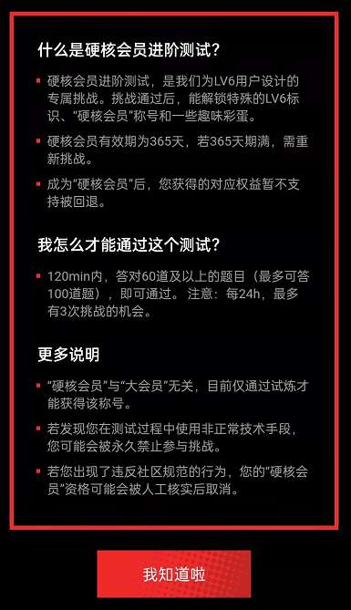 成为硬核会员是有要求的,需要成为LV6用户,并且通过进阶测试,详情规则如下: