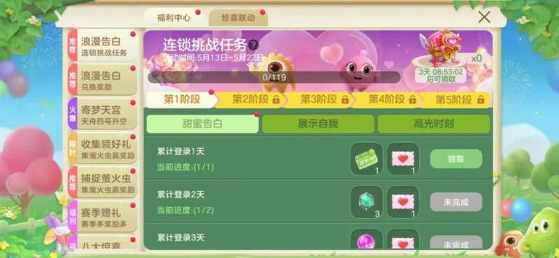 5月13日-5月22日活动内容:活动共分为5个阶段,达到指定的时间解锁该阶段的3个支线活动,通过完成这些任务可以获得超多浪漫奖励。完成任务越多,可开启的告白宝箱也越多哦!
