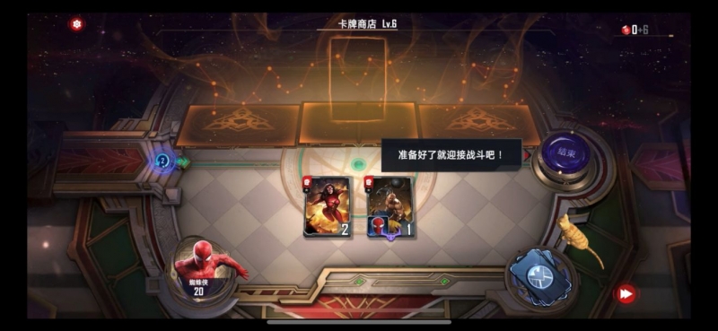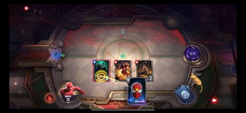 然后到了第二回合先购买蜘蛛侠面具,技能是我方蜘蛛宇宙角色被摧毁时,发动装配者阵亡技能,每场可生效2次,这个装备给吸收人带上。