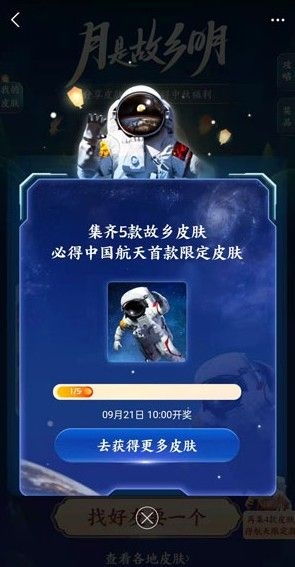 集齐五款皮肤后,可在9月21日10点,在会场开彩蛋必得中国航天中秋限定款皮肤。