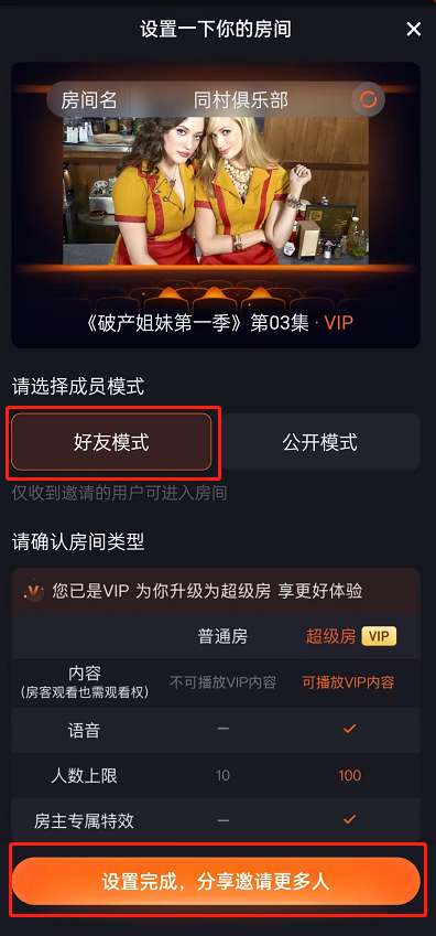 2、VIP用户就会直接升级到超级房间,选择成员模式,再点击“设置完成,分享邀请更多人”。