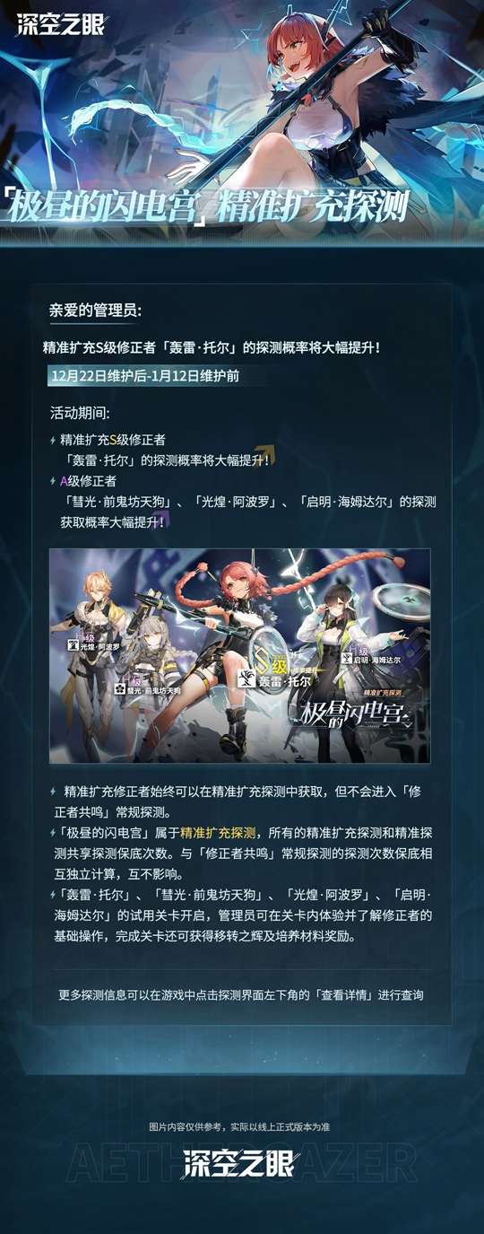 好啦~以上就是有关深空之眼极昼的闪电宫精准扩充探测12月22日将开启的最新消息啦~更多深空之眼手游的一手前线资讯与活动情报内容还请多多期待我们本站的不断更新哟~