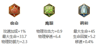 解析:夏侯惇是一个典型的坦克英雄,红色宿命提供攻速和生命物理防御;蓝色铭文调和补充移速和生命回血,更加方便于支援游走;同时绿色鹰眼补足一些伤害。