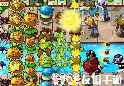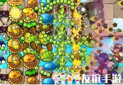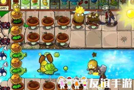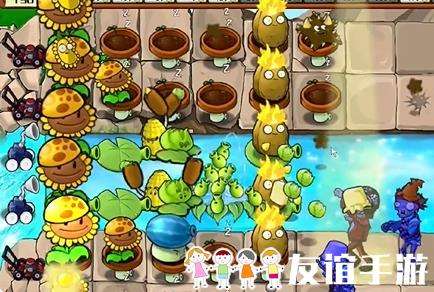 3、然后在左侧补充第二列向日葵,在第五列种植一列火炬坚果,在泳池中补充玉米卷香蒲和豌豆荚许愿池。