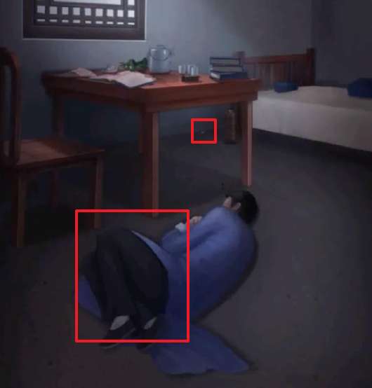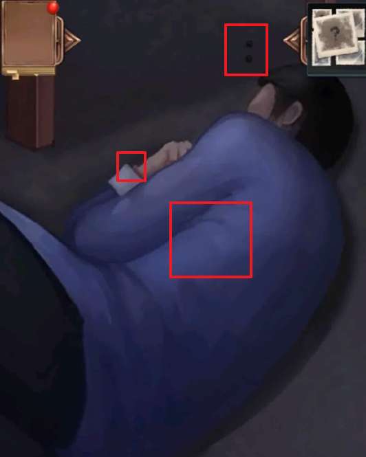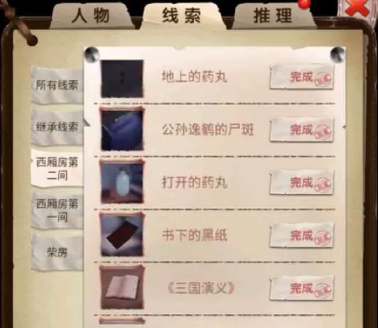 1、接下来进入西厢房二间。在房间当中如图获得线索,点击尸体获得公孙先生死状,白玉蝉碎片