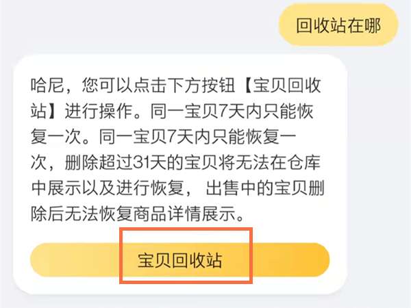 2、发送“回收站在哪”,然后进入客服回复的“宝贝回车站”入口即可找到。