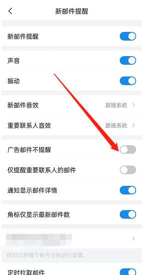 4、点击【广告邮件不提醒】右侧按钮开启即可。