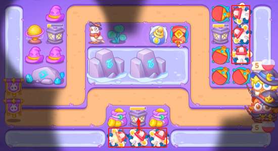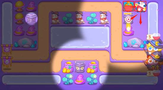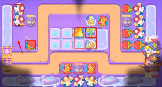 5、最后我们在中间得位置继续放置炮台,这里一定要使用减速泡泡,这一关的难度就在前期要锁头打,否则萝卜会被吃。