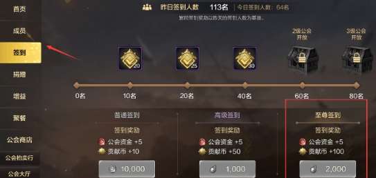 找到左边“签到”功能,可以选择消耗特定资源进行一次签到,推荐优先使用泰拉进行签到,可以获得更多贡献币。