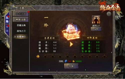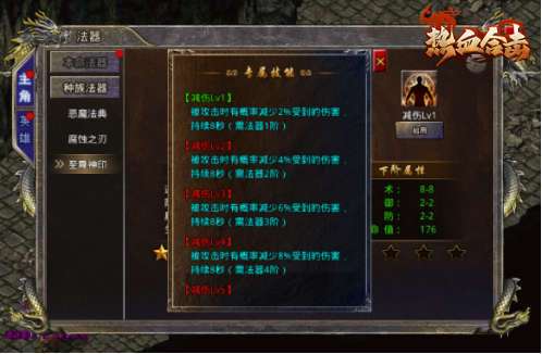 这个法器叫 至尊神印,激活后的专属技能是“减伤”,技能效果是在玩家被攻击的时候有概率减少一定量受到的伤害,持续八秒。这个法器就相当契合战士玩家了,在大部分的战斗中,战士玩家需要冲进人堆里输出敌方重要的输出单位,这时候血量和减伤的重要性就体现的淋漓尽致了,这个法器在触发的时候可以为玩家提供一定量的保护,所以推荐战士玩家以这个法器为主要的升级法器。