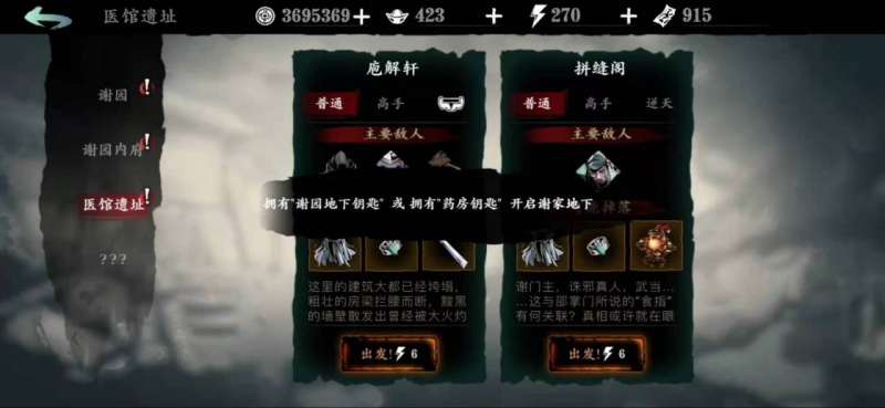 在《影之刃3》中,谢园地下的钥匙分为几种,每种钥匙都对应着不同的地下室: