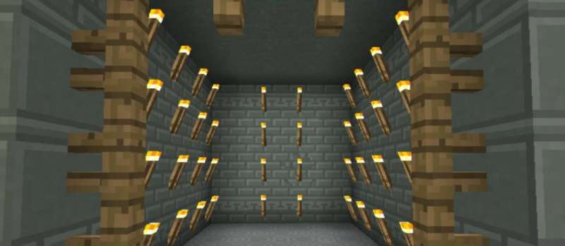 当玩家寻找到第一层内唯一的一个去往第二层的通道,只需要挖破铁栅栏进入到第二层了,到第一层距离第二层的地面有一定高度要注意了。第二层的六面全被基岩围着以避免玩家尝试走一些捷径。此层的深度已经达到基岩层,因此可视范围会存在迷雾,要是喝一瓶夜视药水的情况下能够更好地帮助玩家进行探索。