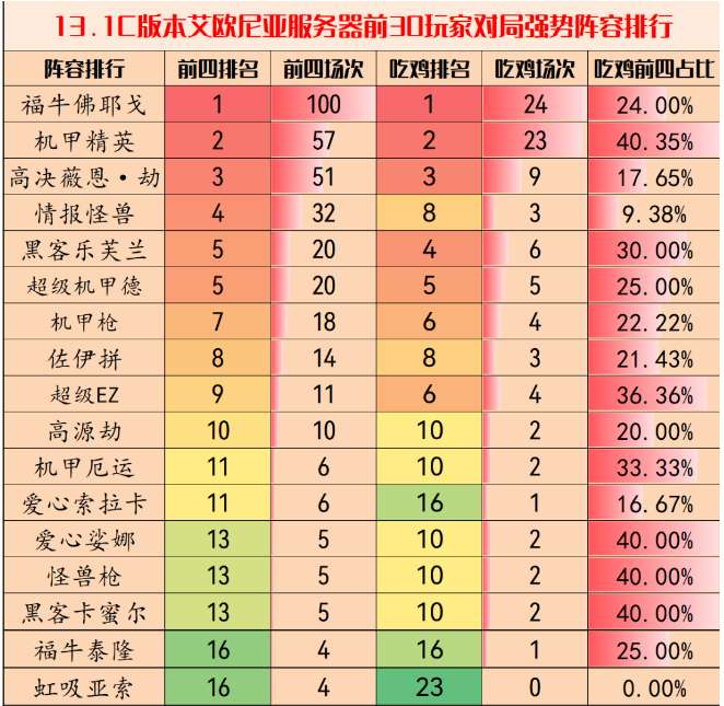 超级机甲德这周吃分场次38场,吃鸡场次10场,吃分与吃鸡排名都是第2名。这套阵容的吃鸡前四占比也高于平均值达到26.32%。