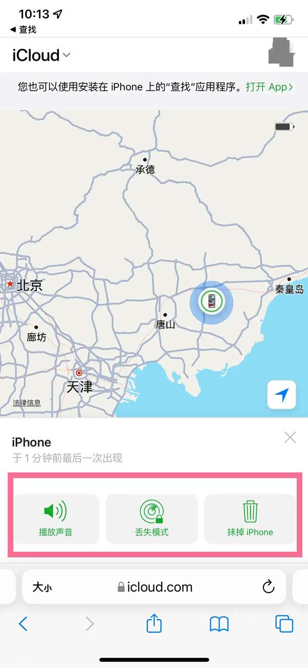 2、点击丢失的苹果手机名称后,进行播放声音、抹除数据等功能操作即可。