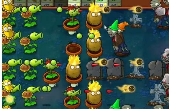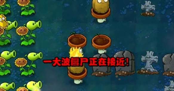 4、第二波僵尸出现后摆放两列的小盆菇并将双发仙人掌和火炬坚果放在下图墓碑旁边的位置。