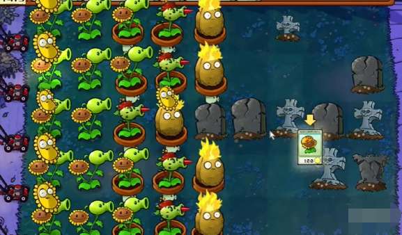 3、第一波首先需要摆放一列豌豆向日葵,然后在墓碑周围放置小盆菇并将火炬坚果和土豆雷放置在小盆菇上面。