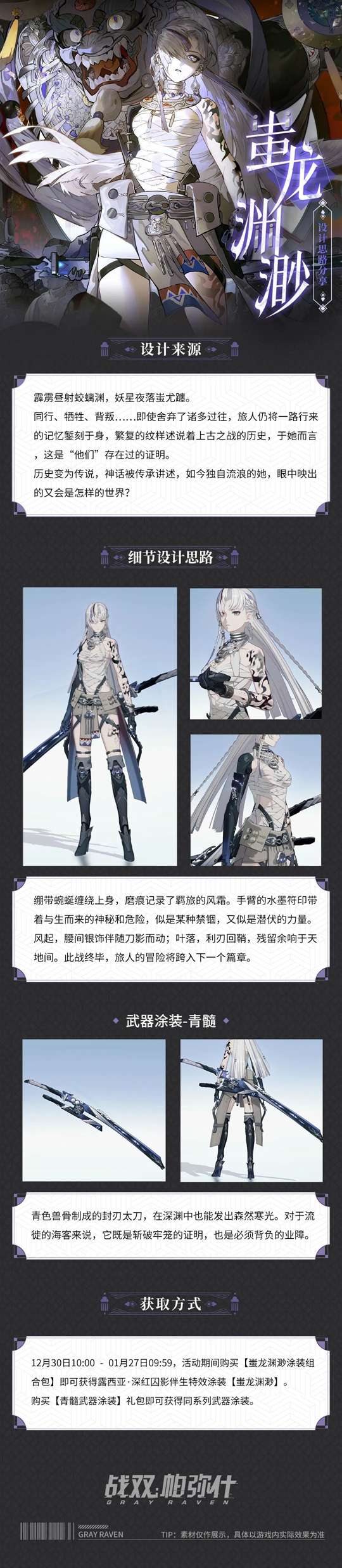 ◆2022年12月30日10:00 - 2023年1月27日09:59,购买【蚩龙渊渺涂装组合包】涂装即可获得露西亚·深红囚影伴生特效涂装【蚩龙渊渺】。