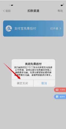 3、进入扣款渠道页面,点击"支付宝先乘后付"