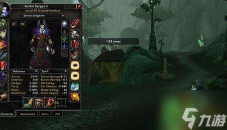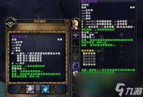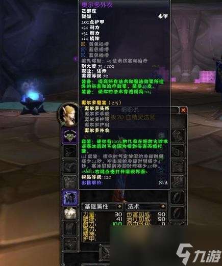 如图,上图的血精灵法师全身只穿了两件T4装备,它们分别是头部(带多彩槽和蓝槽)以及胸部(带一个黄槽和两个蓝槽)。放这个图是为了证明当前人物的装备插槽情况以便后面验证我们上面的多彩宝石生效条件。接着请再看下图: