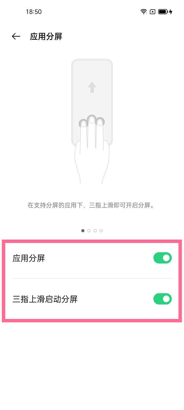 3、开启【应用分屏】和【三指上滑启动分屏】,在支持持分屏的应用下三指上滑即可开启分屏。