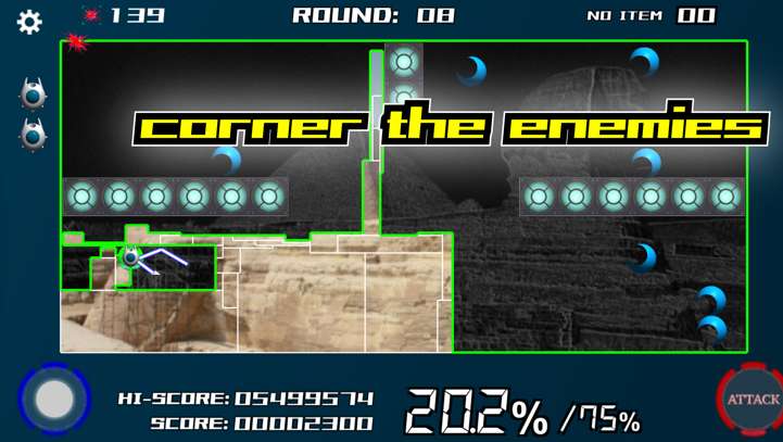 玩家移动他的/她的飞船并在场地上画线以获得区域,同时在方形场地上躲避敌人和子弹。