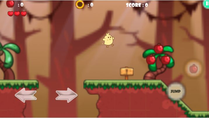 Lost Monkey in Jungle中有一只小鸡,玩家需要控制这只小鸡来进行闯关。游戏中有各种砖块制造的平台,玩家需要做的,就是跳上这些砖块,收集各种积分和道具,最终跳到终点获得胜利。