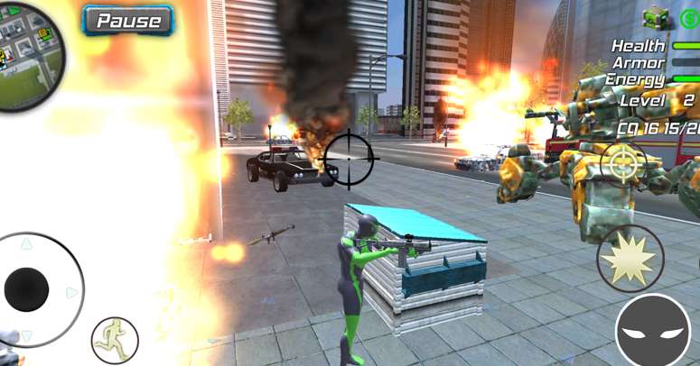 一群愤怒的机器人占领了玩家所在的城市,作为一名英雄,想要拯救自己的家园,就来Spider Rope Flying City Hero这款游戏战斗吧。在游戏中有很多的武器,你可以装备起来,进行更多的冒险。