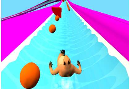 在收集橘子和躲避危险障碍物的同时滑下滑梯。
