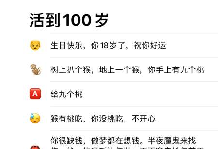 活到100岁是一款趣味性十足的演绎游戏,在这款游戏中,玩家将会面临多样的结局。你的任务就是挑选合适的选项,让自己可以顺利活到一百岁。如果遇到异常情况,你可以先存档,再进行选择。