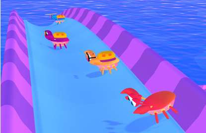 游戏中的赛道是一个巨大的滑梯,玩家可以来此尽情享受到滑动闯关的乐趣。在关卡中还有很多的技能可供玩家解锁,这样你就不用担心被螃蟹撞到滑梯下面了,来试试看吧。
