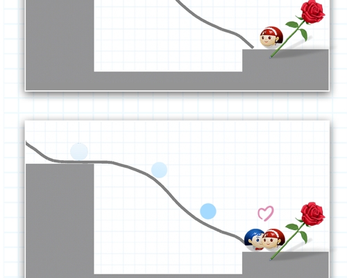 通过画笔搭桥,想办法让红蓝两个小球滚到一起。