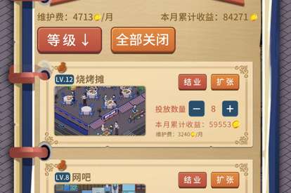 玩家在开局可以选择开网吧或者烧烤摊,完成建设后,你需要开发菜谱或者新技术,完成建设后,你就能赚取金币。等到玩家获得足够的经验后,还能进行升级,获得更多的利润。
