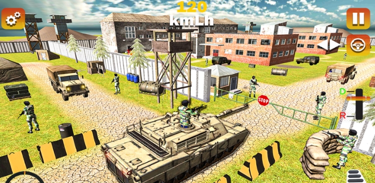通过基地驾驶不同的陆军坦克类型。避开桶、障碍物、交通锥和设备。