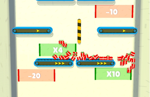 在Delivery Line!这款游戏中有一个制造礼物的工厂,玩家需要在这里帮助工厂完成产品的打包。游戏中有很多的的机关和礼物,玩家需要根据合理的操作让礼物落到合适的位置,然后完成通关。
