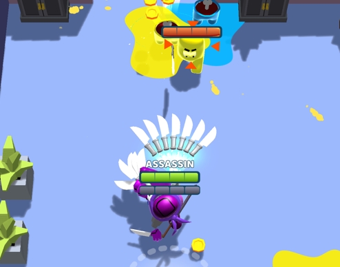 游戏采用了第三人称视角更加方便玩家们的操作,你要时刻保持警惕并精准的射击,手中的飞刀是你唯一的武器。要注意在对战时还要记得收集更多的金币,这样才能解锁更强大的武器装备。
