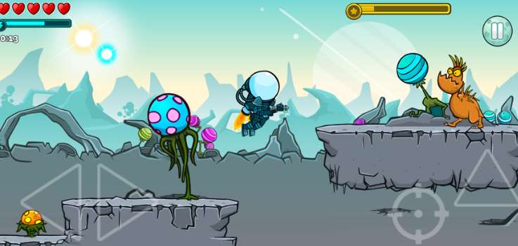 Cosmonaft飞越深渊和悬崖。像火箭一样飞起来,向邪恶的外星人射击,像石头一样倒下,然后重新开始。