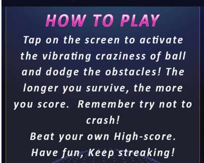 点击屏幕上激活震动的疯狂球和躲避障碍!你持球的时间越长,得分就越多。