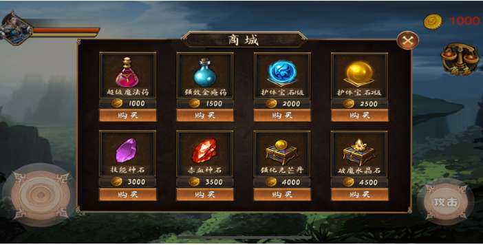 游戏中有很多的道具,当玩家使用这些道具后,你就能获得更强的战力buff。这些道具都可以在商城中购买,玩家击杀BOSS或者野外怪物后,就能获得金币。