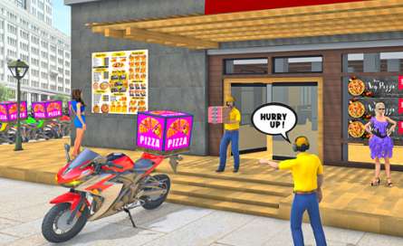 2、拿出你的moto比萨饼送货自行车并上班,订单准备好接收并送到等待披萨的顾客,注意障碍。