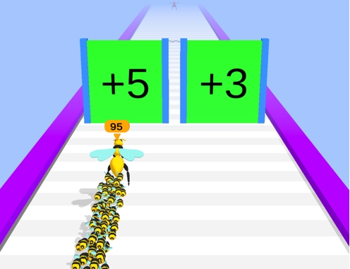 在Bees Runner 3D游戏中你将扮演一只蜂王,你的任务就是带领着自己的蜜蜂军团进行闯关。要注意你要通过各个绿色的通道来增加自己的蜜蜂数量,遇到红色的通道一定要小心躲避噢!
