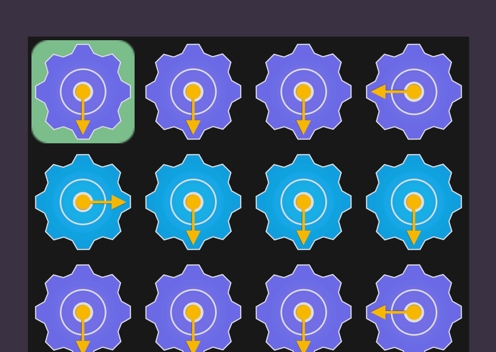 你通过在脑海中推理,找出左侧起始区域唯一正确的一个齿轮,并点击它,使得多米诺效应最终传递到右侧结束区域的某个齿轮,并且该齿轮箭头指向右边。